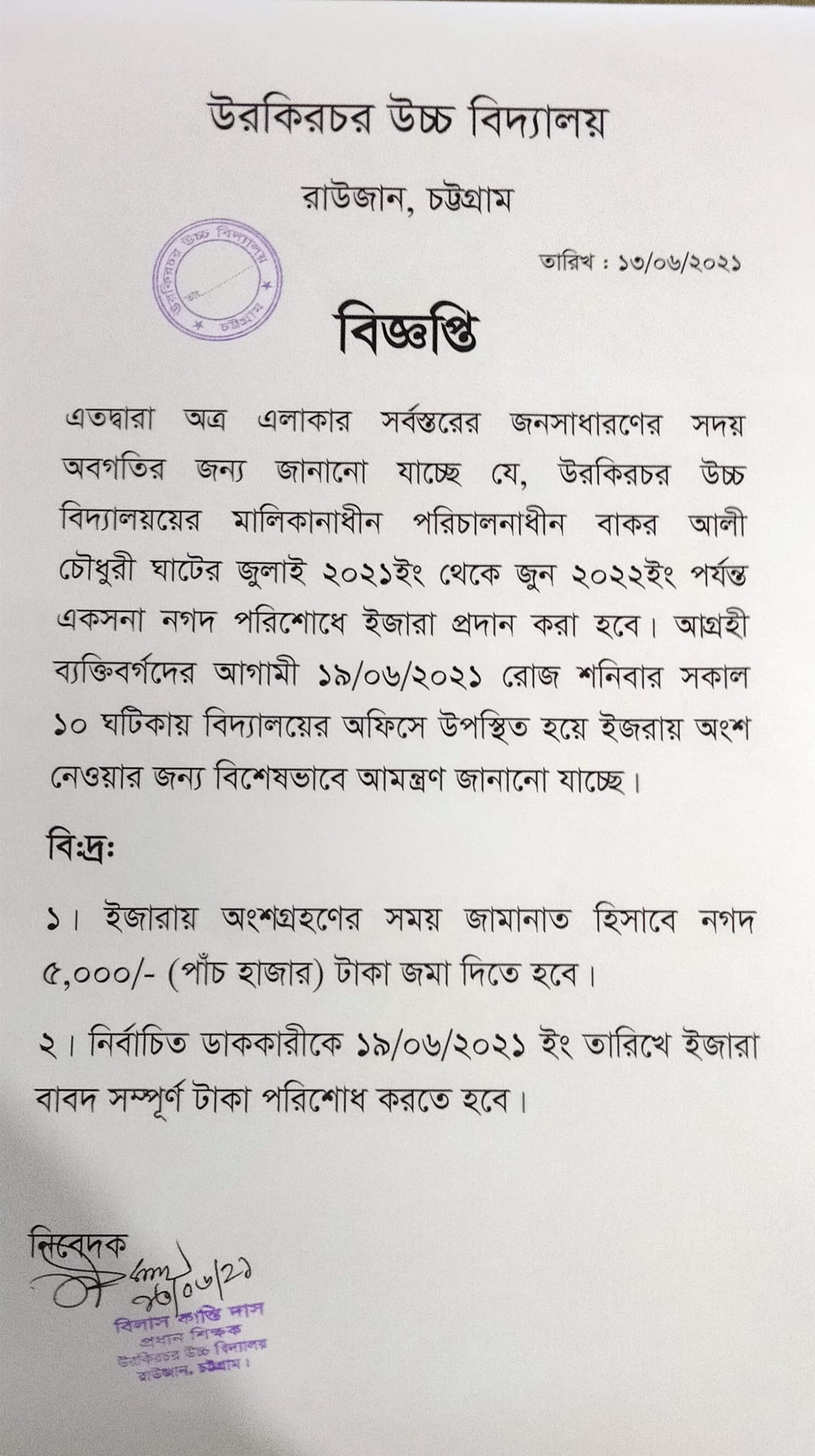 উরকিরচর উচ্চ বিদ্যালয়ের খেয়াঘাট ইজারা সংক্রান্ত নোটিশ